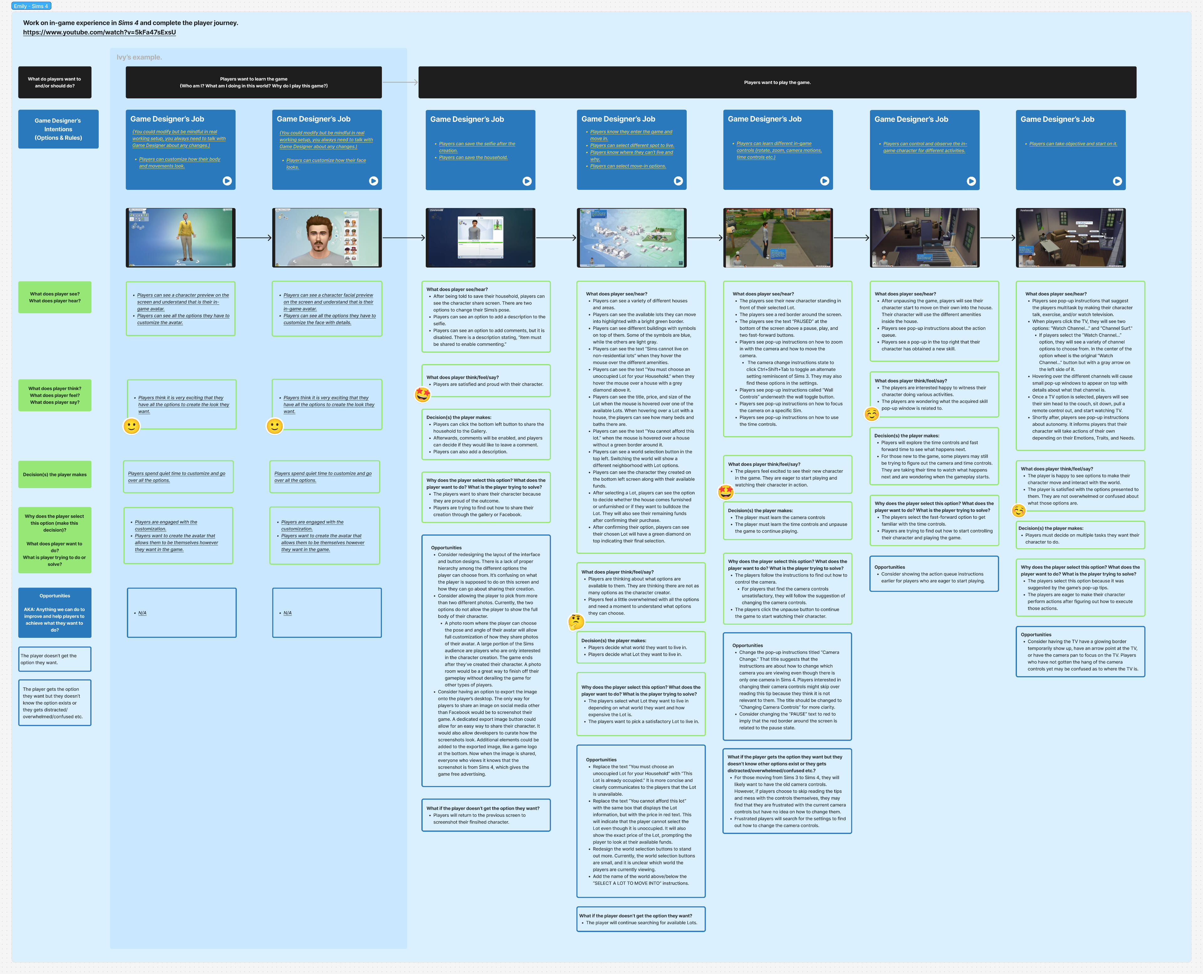 Before starting my redesign, I created a player's journey (similar to an empathy map) to understand the relationship between the game designer's intentions and the player's experience. I analyzed the first few minutes of gameplay to see what areas could be improved upon to bridge the gap between the two parties.