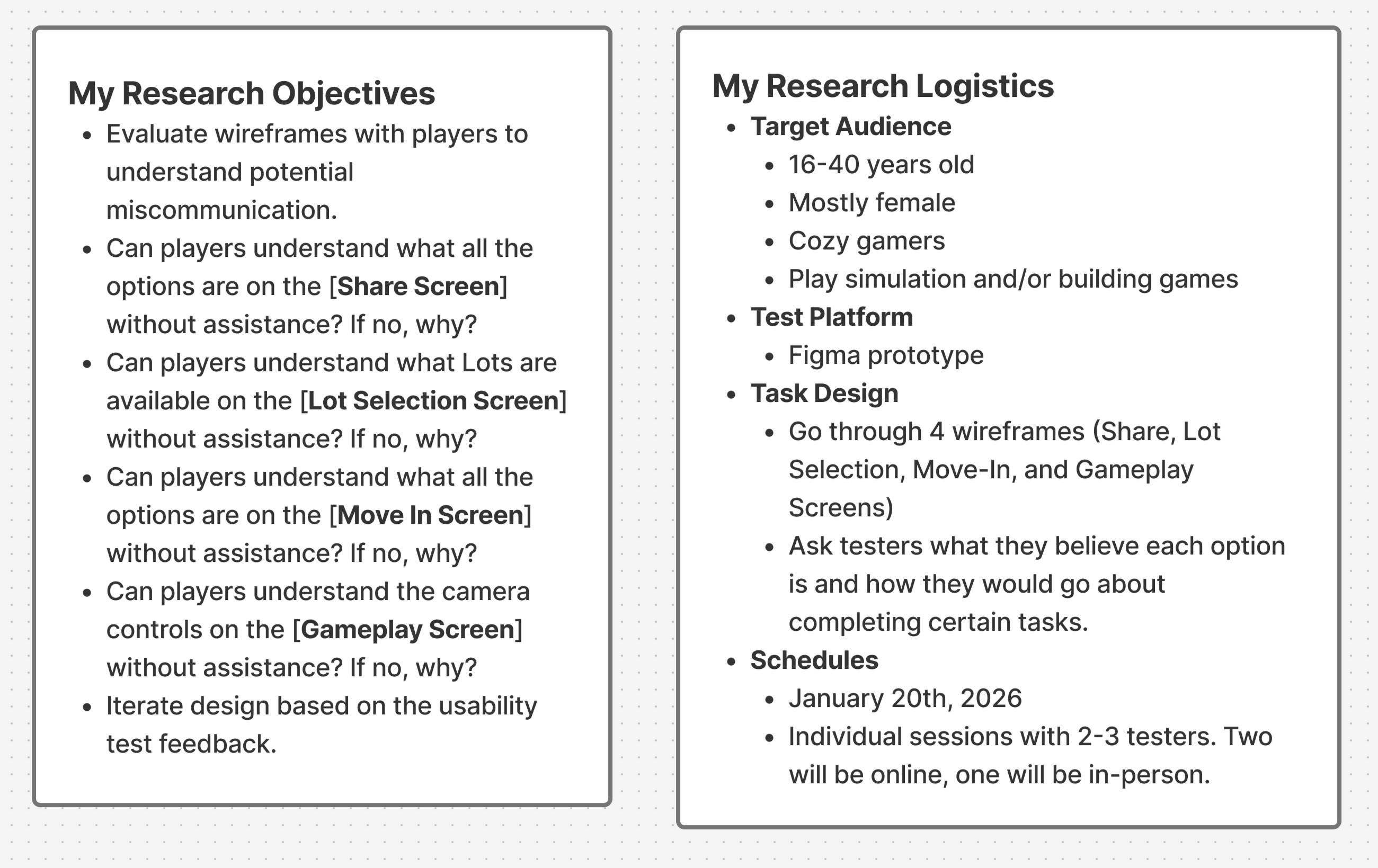 The objectives and logistics of my research were established to understand the scope of my test. I followed a script to easily replicate the test for each participant.