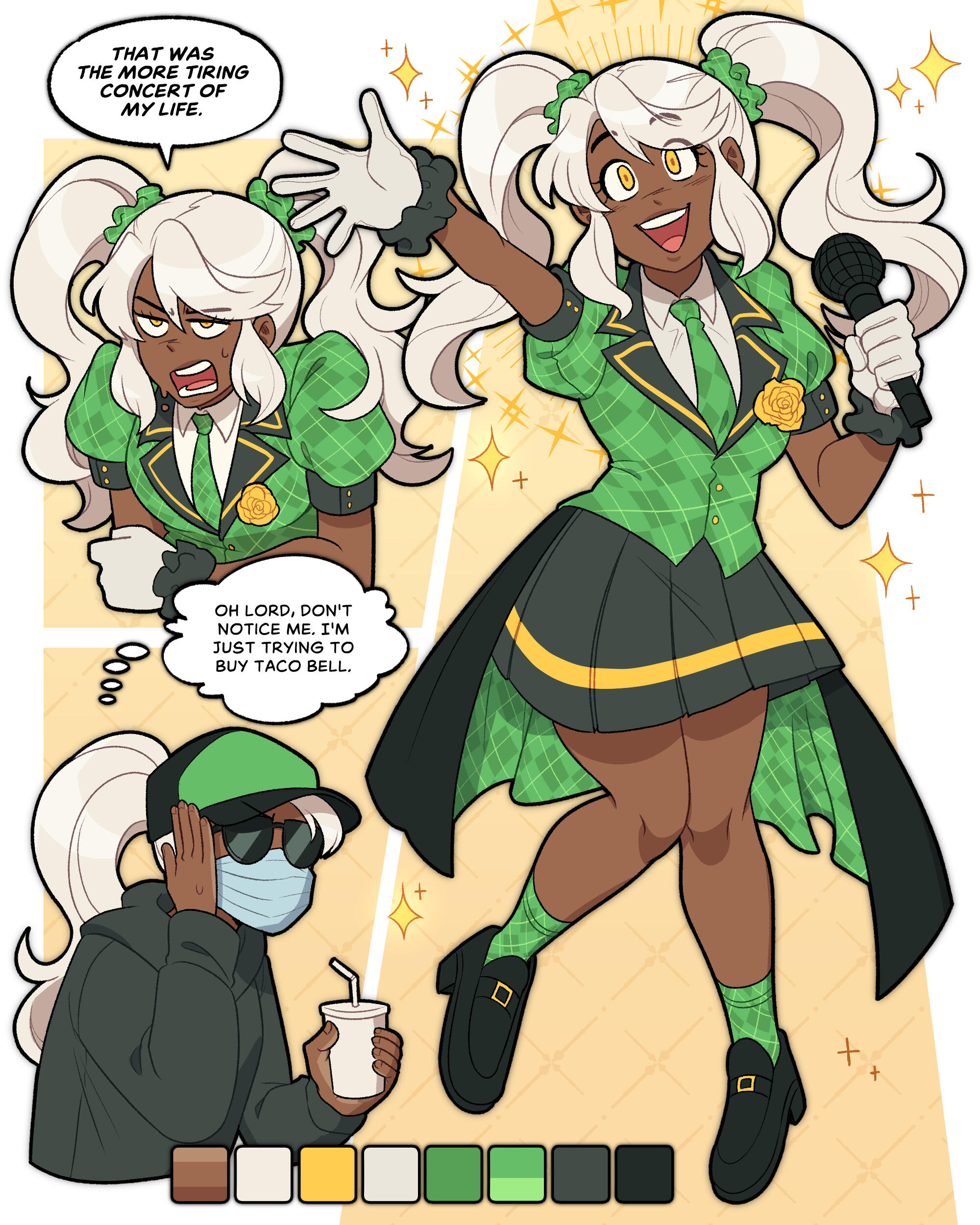 She's an introvert who loves to sing and dance but struggles to do it for a long time. She's basically out of commission after each concert because it takes so much out of her to perform.